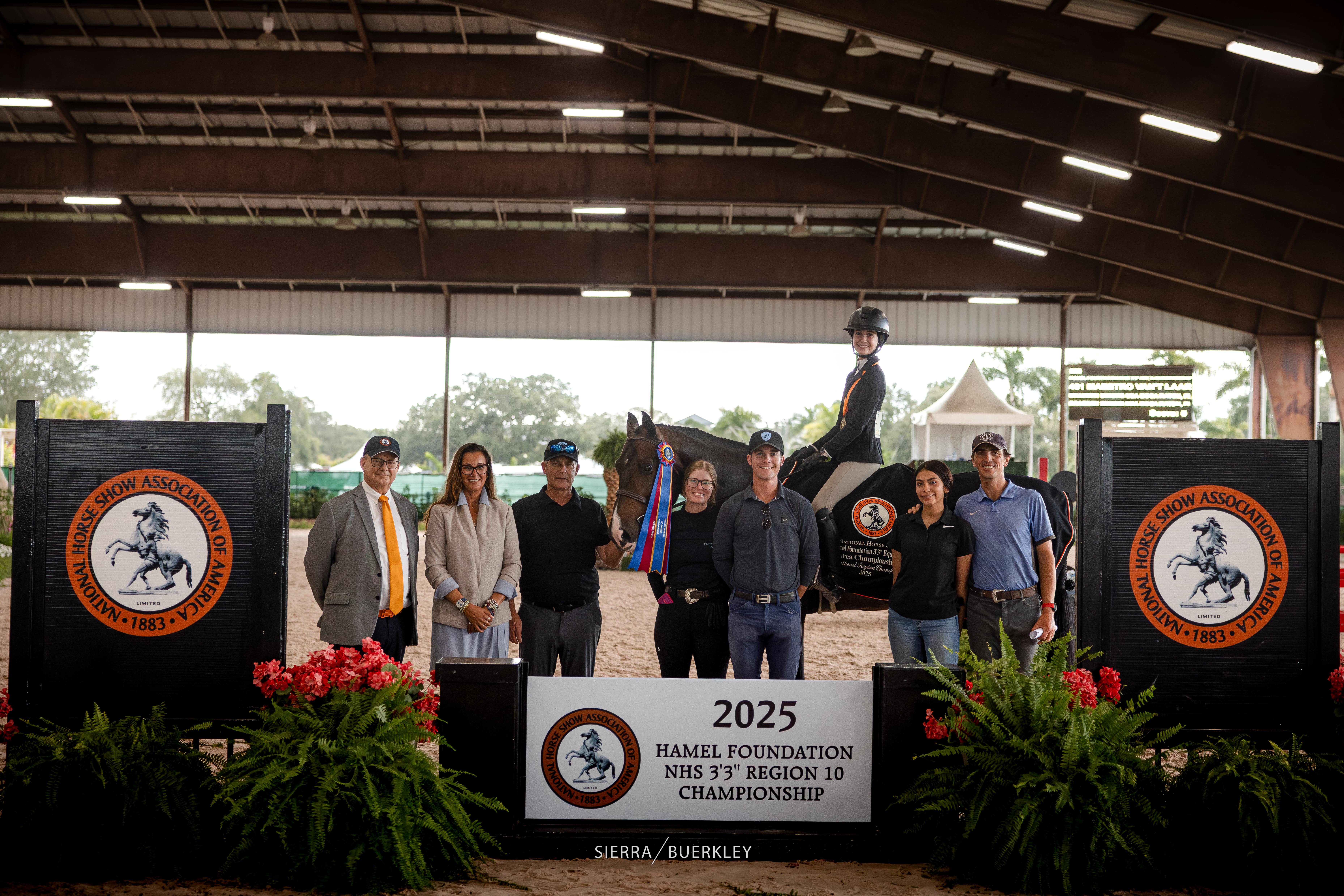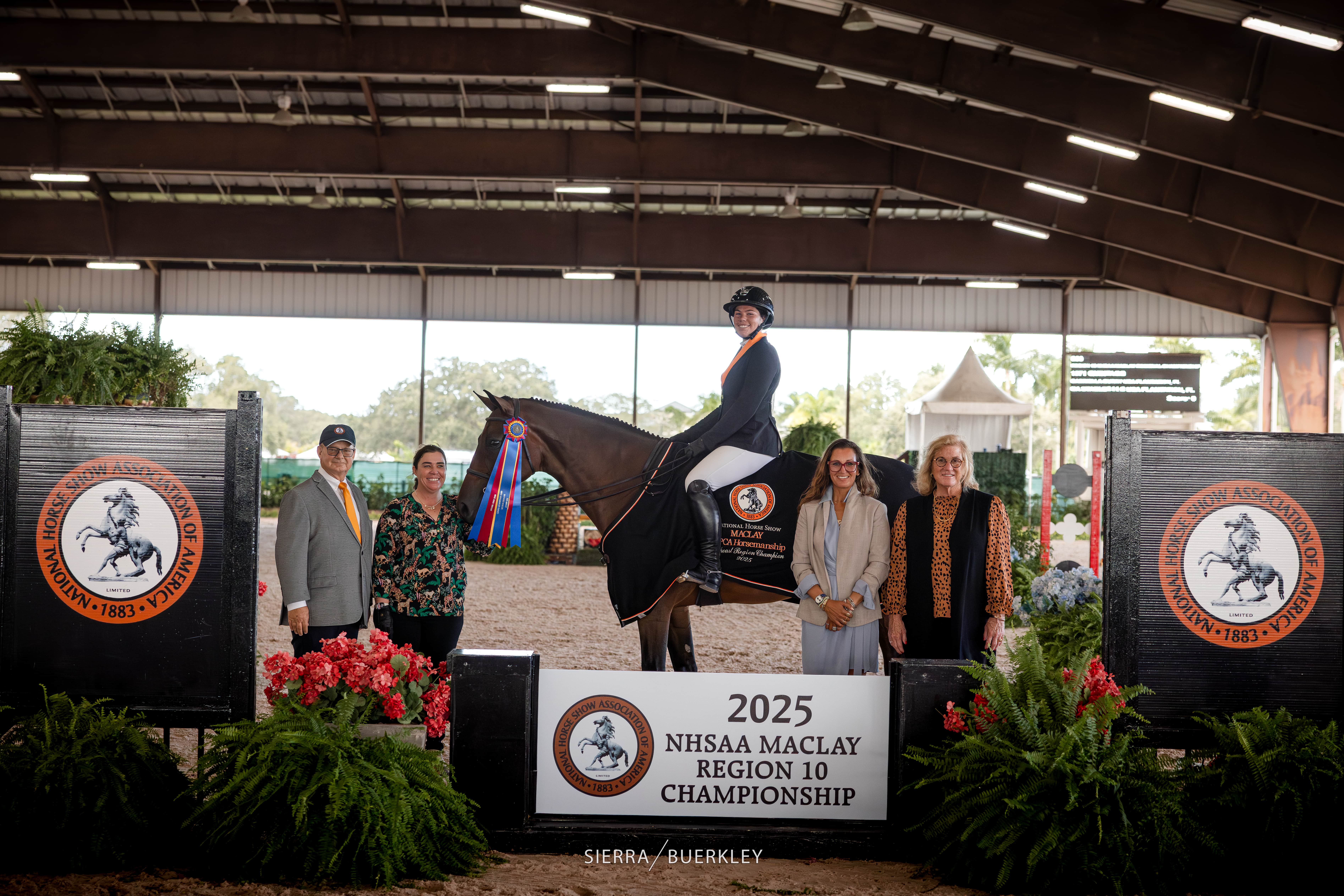 The Region 10 ASPCA/NHSAA Maclay Championship showcased riders navigating a technical over fences round followed by a flat phase. Gabriella and her own, Quintago, impressed the judges to receive champion. Reserve went to Isabelle Castellanos and her own Remington, while Katherine Mercer and Vigo Van Koningspolder Z, owned by Abigail Gordon, rounded out the podium.