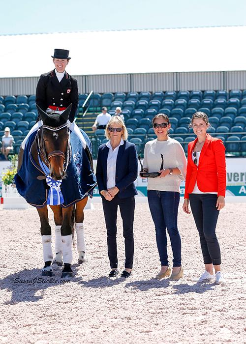 | Belinda Trussell and Anton in their presentation ceremony with judge Isobel Wessels (GER), Lisa Apa of Today’s Equestrian, and Cora Causemann of AGDF. |