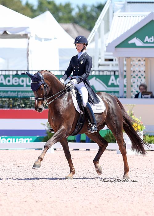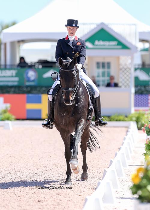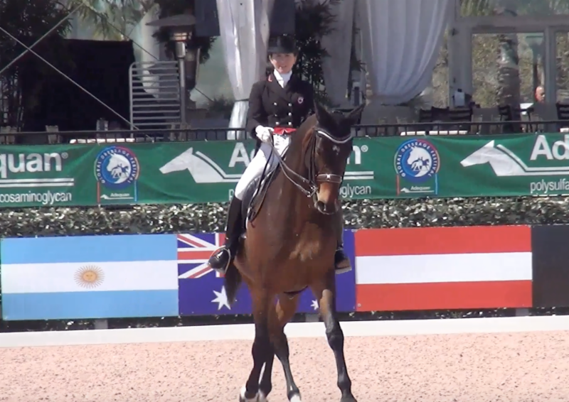 Woodstock and Page are forging a strong relationship, which is improving the quality of their tests from beginning to end according to Page. With the trot work now fluid and expressive, the final piece they will look to improve will be the canter work. “The highlight for me today, just like Belinda was saying, is consistency through the ride. The quality in the trot is almost matched by the overall quality of the canter and the horse has such talent for pirouettes, it’s amazing. You want the whole thing to be on about the same score if you possibly can,” she explained. “I was really pleased with that today, because he let me ride the half-passes and the flying changes much better than he did on Friday.” Tomlinson, who winters abroad in Wellington, FL, from her typical home base in the U.K., rode Rosalie B in their second competition together to earn a 72.078%. Tomlinson commented on the progress the new pair has made in just two shows together. “I was very happy with her. It was her second show ever at the Grand Prix level and her second show with me ever. I’m thrilled with how much she’s come together just since the last show,” said Tomlinson. “She’s much more confident in the ring, and easier to ride. I feel very happy with the way she’s going and the way she’s improving. We didn’t actually have any mistakes today.” “She’s still lacking the strength a little bit, but she’s obedient with it. We had a great ride together and I’m thrilled,” she noted.