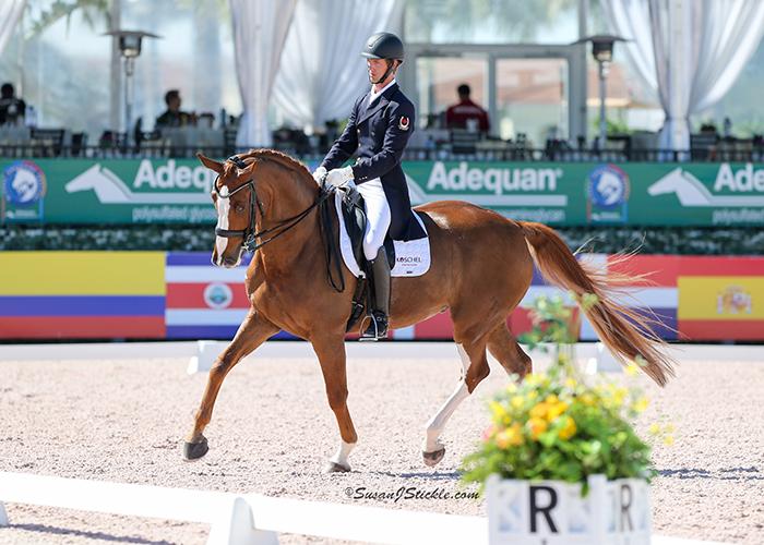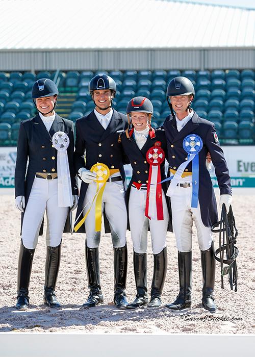 Chris Von Martels (CAN) won the second annual Palm Beach Dressage Derby Exhibition at AGDF, besting fellow international riders Laura Tomlinson (GBR), Adrienne Lyle (USA), and Juan Matute, Jr. (ESP). Von Martels and Tomlinson went head-to-head in the final round of competition aboard Patricia Koschel’s Leuchtfeuer DE. Each rider had a five-minute familiarization period with each of their rides, prior to riding an FEI Prix St. Georges test before a panel of three judges. Von Martels started the competition off aboard Legacy’s Ambicioso, a 2005 P.R.E. gelding owned by Deborah Berger, and would earn a 64.605% from the judges. Paired with last year’s champion, Adrienne Lyle, Von Martels made the most of the pair’s time in the arena to advance to the final round of competition. Lyle received a 64.254% in a close competition, earning an overall fourth place.