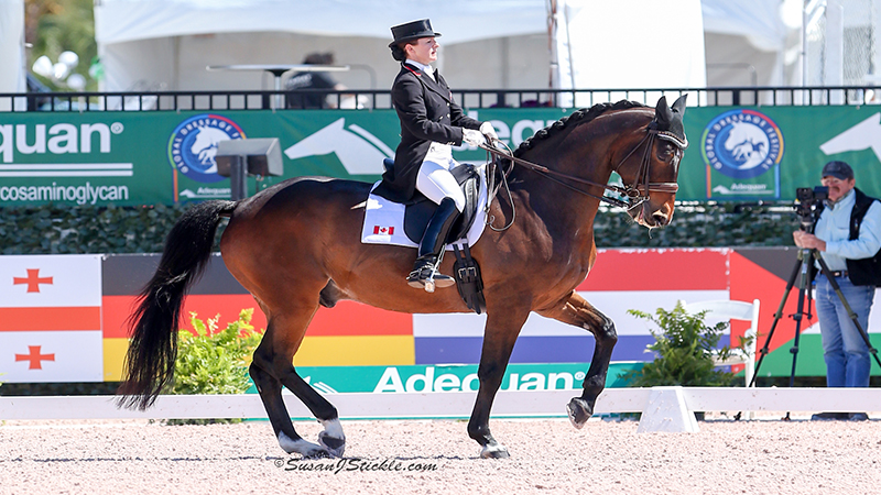 Arlene “Tuny” Page and Woodstock, one of her two talented Grand Prix mounts, performed another accurate Grand Prix Special test which secured them a second place finish in the competitive class. Woodstock, a 2003 Dutch Warmblood gelding (Havel x Mirania) looked soft and relaxed, which Tuny said has been a steady progression throughout each of their tests this season.”The fact is, this horse is incredibly expressive and is blessed with a tremendous amount of scope and elasticity. He has so much power. It’s always a challenge to figure out how to channel that power but not take it away,” said Page. “Believe me, the chicken in me occasionally says, ‘You just have to tone everything down,’ but then of course, you lose the extravagance that has him on a 78% before the canter.” “I’m learning how to balance out the expression that he has with a little bit more zen, if you will, in the canter, which is where he carries more tension and can be more mistake-prone,” she continued. “Last year in Europe, I didn’t find this kind of tension, like what I have here. For him, whatever reason, this venue is a little bit more challenging and it’s been great to have him remain solid in these scores even though for him it can be a little bit more exciting for him.”