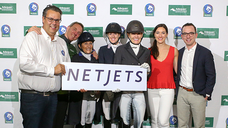 The prize-giving was held indoors to avoid the rain: AGDF’s Thomas Baur, Allyn Mann of Adequan , riders Shelly Francis, Brittany Fraser and Ashley Holzer with head of partnerships Catherine Zazon and sales executive Chuck Jones from NetJets.
