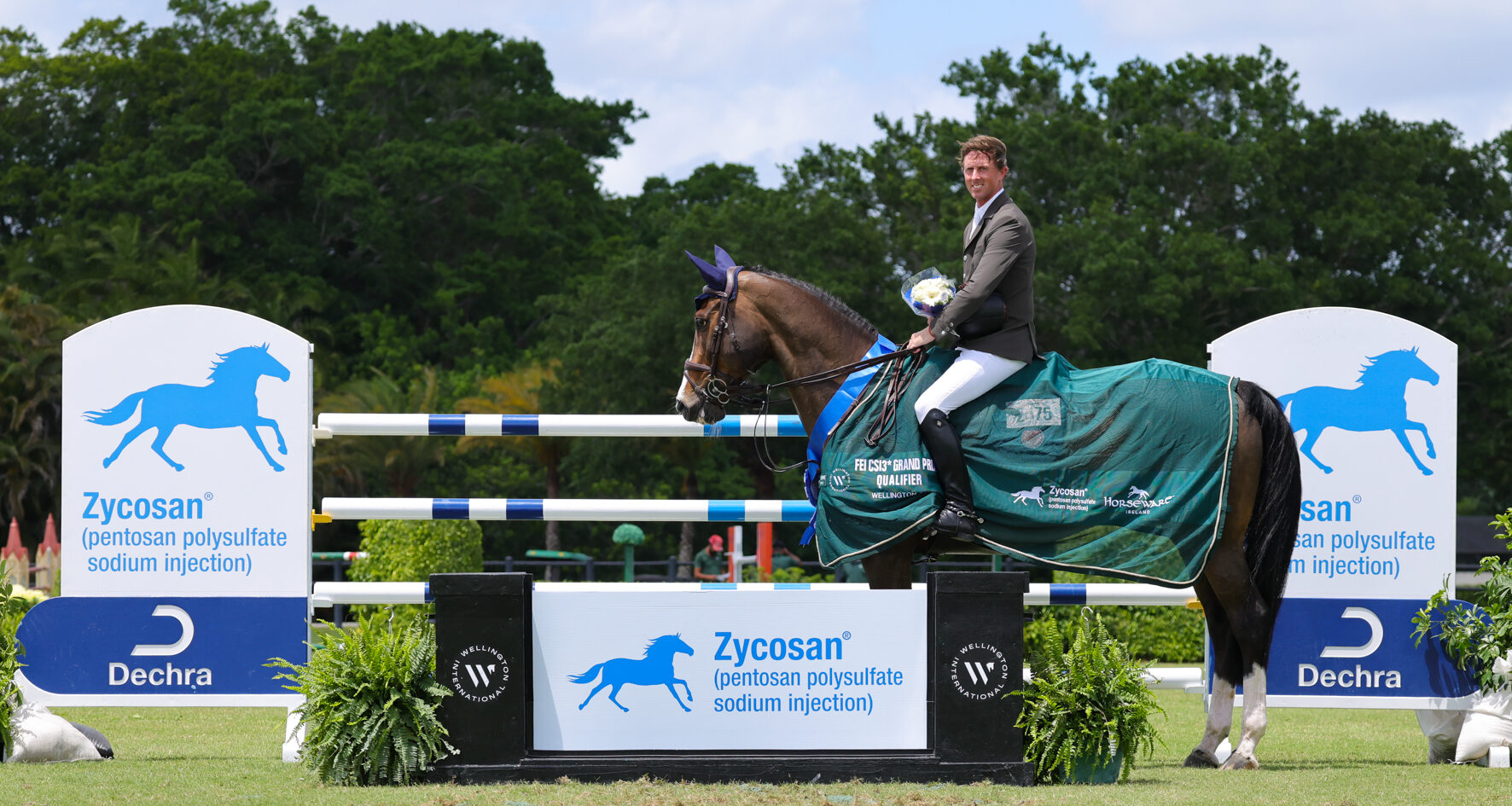 Wellington, Fla. – April 10, 2026—British Olympic champion Ben Maher took to the derby field on Friday afternoon to win the $62,500 Zycosan CSI3* Grand Prix Qualifier when aboard 15-year-old Ginger-Blue (Plot Blue x Royal Bravour) for owner Jane Forbes Clark during the second week of the Wellington International Spring Series, presented by Florida Coast Equipment.