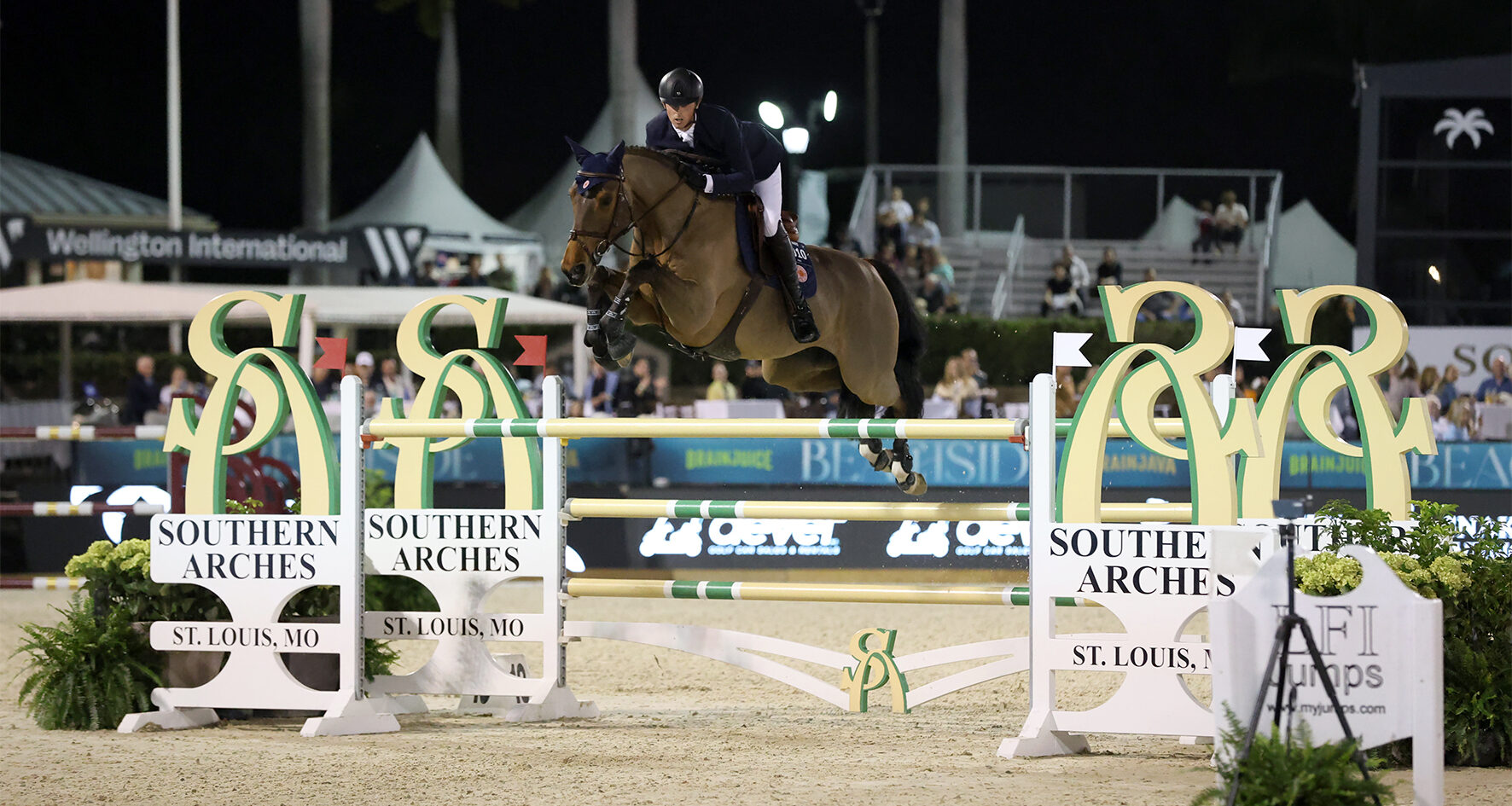 British Olympic Champion Ben Maher and Enjeu de Grisien wowed a Wellington, FL, crowd in the first’Saturday Night Lights’grand prix of the season at Wellington International on the evening of January 13. The pair won the $140,000 Southern Arches CSI3* Grand Prix from a 45/horse field over tracks designed by USA’s Nick Granat.