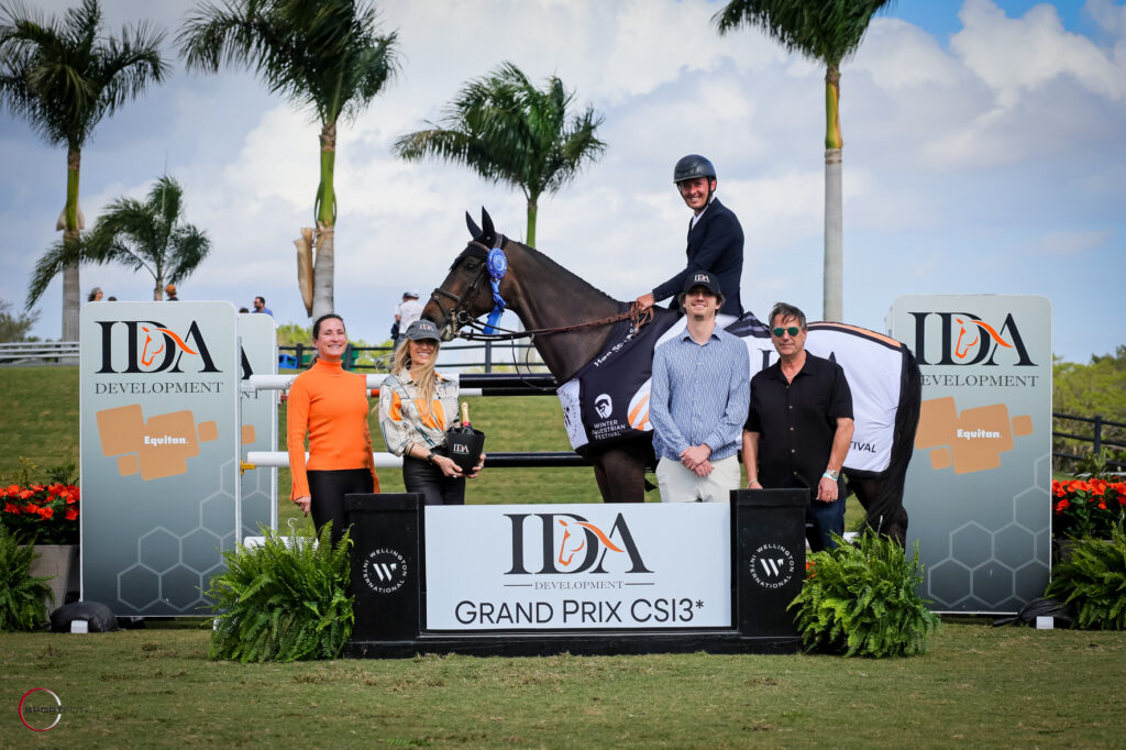 Bertram Allen & Pacino Amiro are presented as winners of the $140,000 IDA Development CSI3* Grand Prix by Christine Deka, Theresa Knopp, Shane Knopp and Harry Knopp. Photo © Sportfot