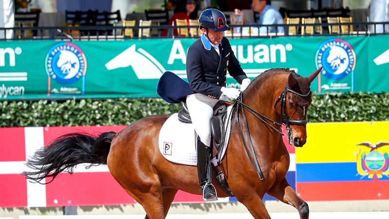 For Immediate Release Alice Collins for Jennifer Wood Media, Inc. Wellington, FL – February 23, 2020 – Cesar Parra (USA) nailed a huge new personal best in the FEI Intermediate I CDI3*, presented by Restylane. He rode Mr Bumblebee, Karen Blank’s shy 12-year-old gelding by Sting to 75.535%. The pair were the unanimous winners in the eyes of all five judges on the concluding day of the five-star week seven of the 2020 Adequan Global Dressage Festival (AGDF) at the Palm Beach International Equestrian Center (PBIEC) in Wellington, Florida. AGDF 2020 runs for 12 weeks, through March 29. Sweden’s Ida Mattisson finished second with Edison Van Twinwood (72.005%) with Canadian rider Ariana Chia filling third with 71.745% on her own Fiderflame. Some last-minute confidence-building tactics with Mr Bumblebee paid dividends for Parra, a Colombian Olympian who switched nationalities to ride for the USA in 2008. We used to say that not every day’s a Sunday, but today’s a great Sunday, he enthused. I’m sure a lot of us riders ask ourselves why we do this, and when we have a ride like this, that’s the answer, to share a great ride with a great partner like him. We’ve been working very focused and consistently with this horse and I really believe in him. He’s been in our barn for a few years with different riders and he’s just a late bloomer, so I’m happy for him and the owners who have supported so much.