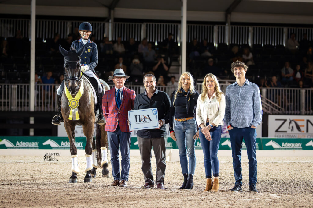 Geñay Vaughn & Gino were second in the IDA Development CDI-W Grand Prix Freestyle, earning Vaughn the Leading Lady Rider Award, sponsored by Frank & Eileen and presented by Thomas Baur. Photo ©Centre Line Media