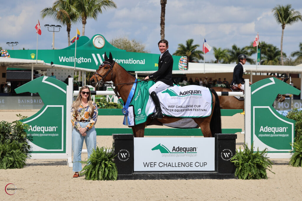 Darragh Kenny & Eddy Blue are presented as winners of the $116,100 Adequan® CSI5* WEF Challenge Cup Round 7 by Chelsea Sinkbeil, Manager of Sponsorship and Events for American Regent™ Animal Health. Photo ©Sportfot