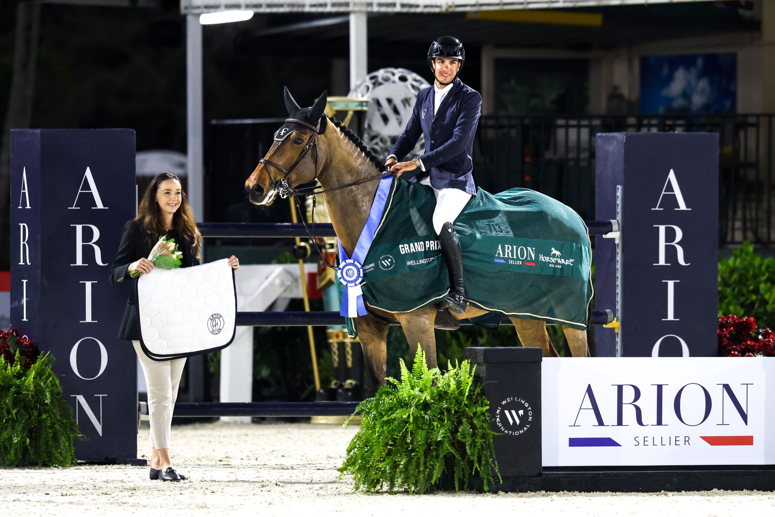 Francisco Goyoaga Mollet and “PST De Muze” presented as winners of the $50,000 Arion Sellier National Grand Prix © Wellington International // Cassidy Klein