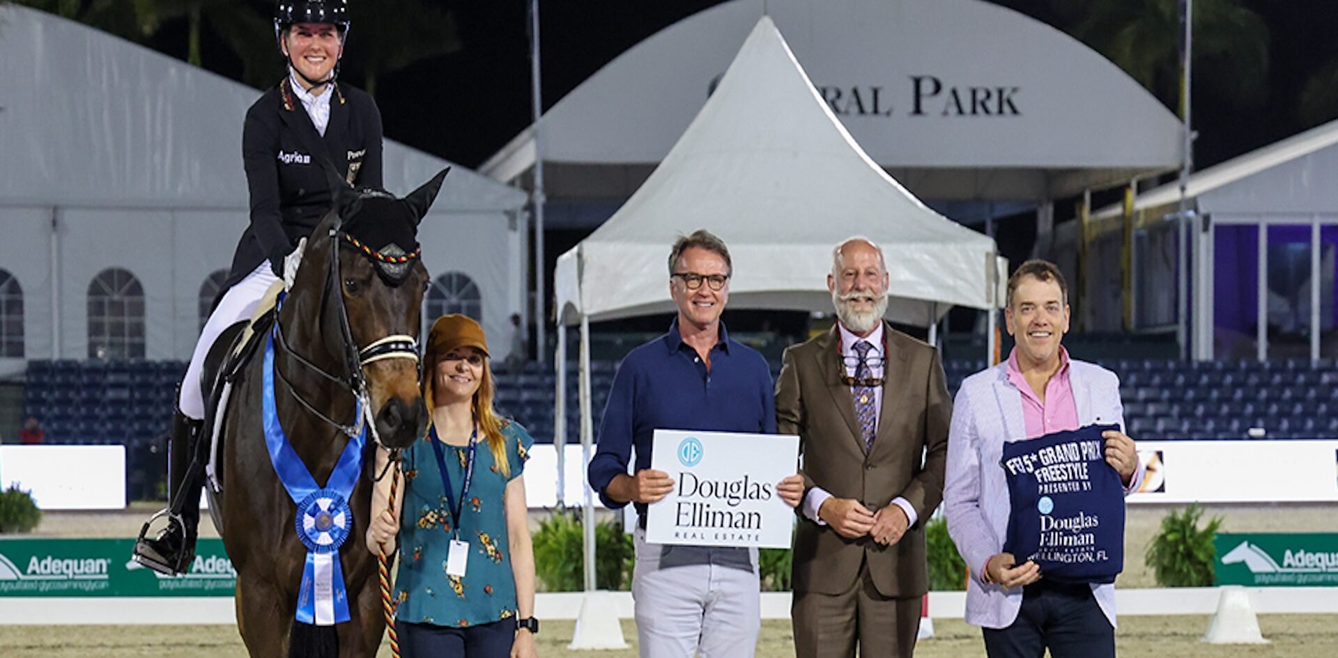 Felicitas Hendricks & Drombusch OLD are presented as winners of the Douglas Elliman Real Estate CDI5* Grand Prix Freestyle by Don Langdon and Scott Durkin of Douglas Elliman with Judge at C Michael Osinski. Photo (C) SusanJStickle.com