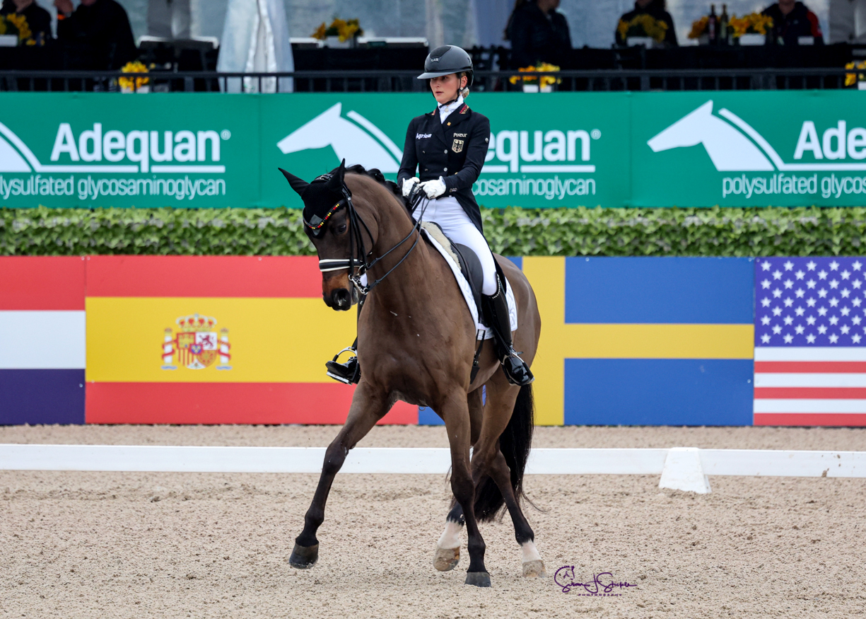 By Alice Collins for Wellington International Horses who traveled to Florida for the winter season did not have to acclimate to the weather on Thursday, January 23, as the opening day of week three at the 2025 Adequan Global Dressage Festival (AGDF) in Wellington brought unusually low temperatures in the mid 50s and a chilly wind. None of that fazed 23-year-old German rider Felicitas Hendricks as she and Drombusch OLD (Destano x Dimaggio) produced a 72.457% test-with a high score of 73.696% from Dutch judge Monique Peutz-Vegter-to top the FEI World Cupo Grand Prix, sponsored by Douglas Elliman Real Estate.