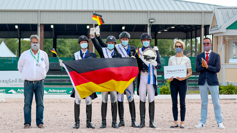 For Immediate Release Kim Beaudoin for Jennifer Wood Media, Inc. Wellington, FL – March 18, 2021 – It was the second day of competition for the FEI Stillpoint Farm Nations Cupo CDIO3* at the Adequan Global Dressage Festival (AGDF), and the team from Germany took home their first ever gold medal at the Wellington Nations Cup with 448.568% on Thursday, March 18. A hairsbreadth behind for the silver medal was the team from the United States, who earned 448.381%. Canada was awarded the bronze medal with 437.071%.