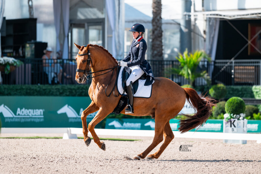 On choosing to bring Special Blend, the youngest horse in the class of 11 starters, she added, “He’s really honest, he travels well, and he’s uncomplicated. Nothing around the show affects him. Yesterday, I trained a bit under the floodlight in the evening, and he was a bit tense, but he settled down and I was very happy this morning. The warm-up was super, and I felt that he was so much more relaxed in the arena. He has real highlights in the piaffe/passage, and all the canter work was nice. I could celebrate on the last centerline and bring the test to the end in a very lightweight way, which is good to see and to feel.”