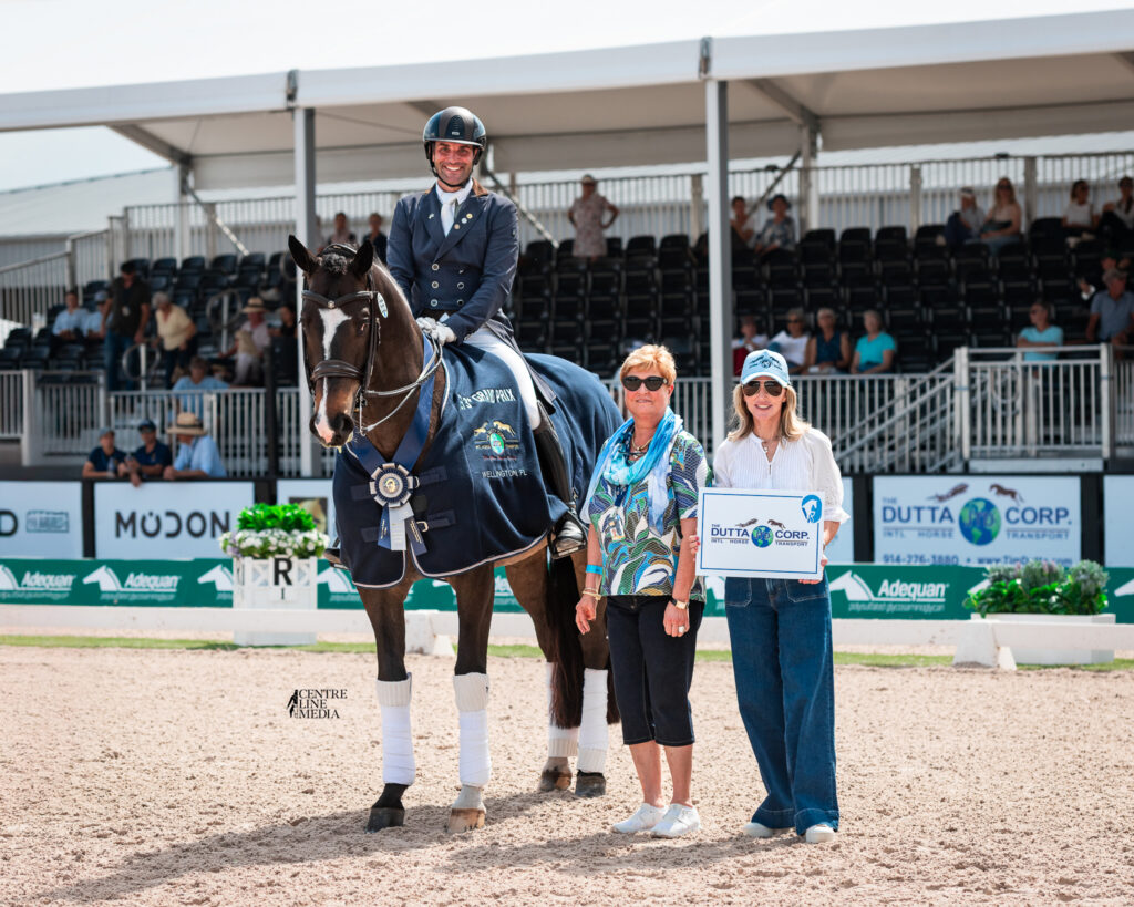 Jordan LaPlaca (USA) was the very first rider down the centerline in the Dutta Corp CDI3* Grand Prix, marking a host of firsts for the multi-talented horseman from Connecticut. Riding his own and Nancy Hutson’s 11-year-old gelding Gold Play (Grey Flannel x Sir Donnerhall II), they pulled off a personal best 68.913% performance to lead the class and hand them their first ever CDI win at their second show at the level.