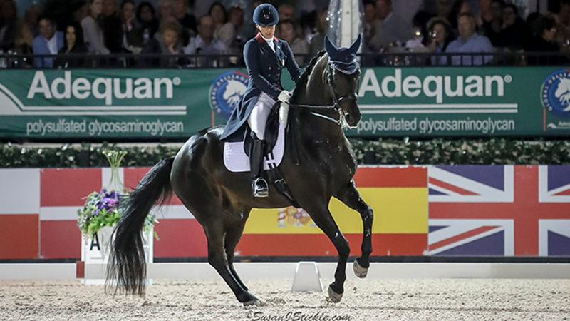 2016 Olympic bronze medalists Kasey Perry-Glass and Goerklintgaards Dublet, a 2003 Danish Warmblood gelding (Diamond Hit x La Costa x Olympic Ferro) owned by Diane Perry, earned a winning score of 80.805% in the FEI Grand Prix Freestyle CDI-W, presented by Everglades Dressage. “[My trainer] Debbie [McDonald] and I have been working really hard on his performance in the ring, and it just seems to get better and better,” said Perry-Glass. “We are slowly getting there and I try not to pressure him too hard. He’s still growing. But to win tonight, it felt good. It felt like I could finally breathe.” “My choreography was created by Adrienne Lyle,” said Perry-Glass of her freestyle choices. “She did the whole thing, and I’m so blessed to have her as a friend. Tom Hunt did my music. He is also the creator of Charlotte Dujardin’s music. I’ve been working with him for four years now. He just wanted something very special for Dublet, and I think he nailed it.”