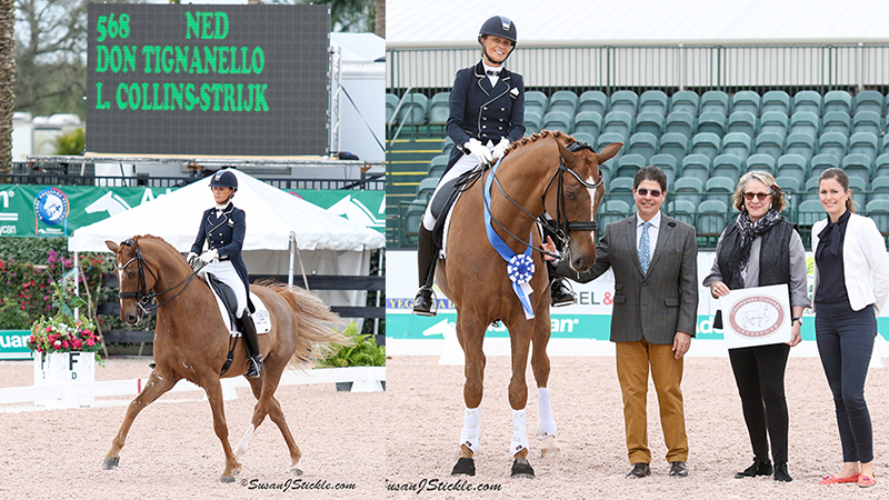 “I’ve been working a lot on the canter work. He’s such a big horse and the balance for him is really hard. I think it will be the focus again for the next few weeks too,” explained Collins-Strijk when asked what she believes the pair has improved on over the course of the week. “In the freestyle, I was definitely better with the music. Last week I wasn’t really sure where I was going because we had not done it together many times, but I practiced it this morning and was much better on track.” The pair, who have started to work on the basics of the Grand Prix movements, will continue their course at the Small Tour level over the next few weeks, as Collins-Strijk believes they will gain valuable experience for their anticipated transition to Grand Prix at some point during the year. “We won’t move up until I’m confident that we can do really well. We’re not 100% there and even when I feel like we are ready to move up, we will do some of the National shows first to get more experience there too,” she noted. Zantros (Krack C x Hinde-Utopia), another mount for Collins-Strijk, made his debut at AGDF this week in the Small Tour alongside his stablemate. The pair also earned top finishes including a fourth place in the FEI Prix St Georges and a third in the FEI Intermediaire I, but with only one horse allowed to compete in the freestyle per rider, Collins-Strijk chose Don Tignanello for the class. “I love Zantros. He’s by Krack C and you can just sit there and look pretty because he does it and knows his job. I quite like that, but you can’t take two horses in the freestyle, (so) I’m hoping to also do the freestyle with him at some point as well,” commented Collins-Strijk.
