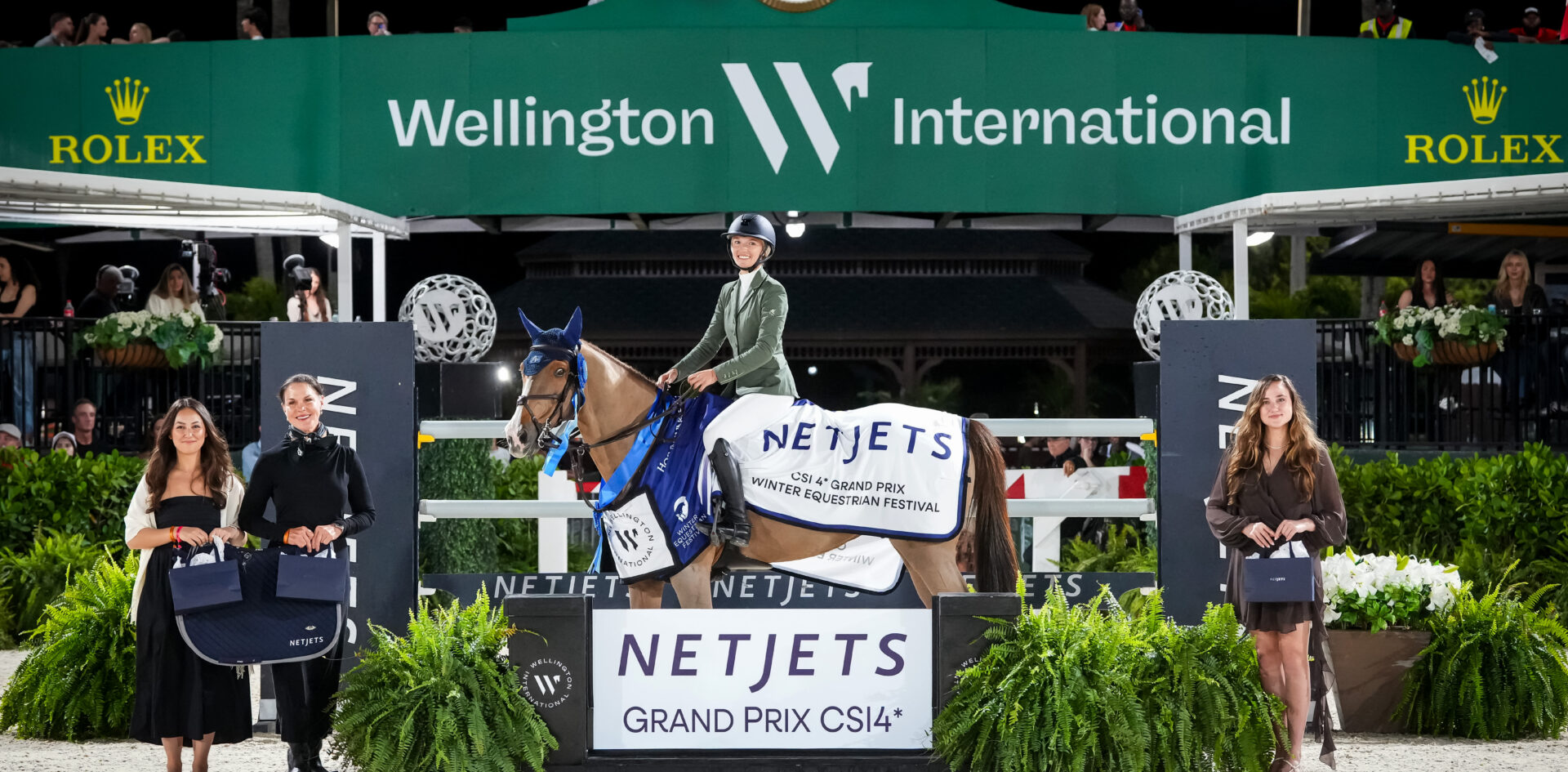 Lillie Keenan & Fasther are presented as winners of the $215,000 NetJets CSI4* Grand Prix by (left to right) Akhane Kopechek, Marketing; Laura Southard, Senior Manager of Strategic Partnerships for NetJets; and Melissa Dombro, VP of Sales. Photo ©Sportfot