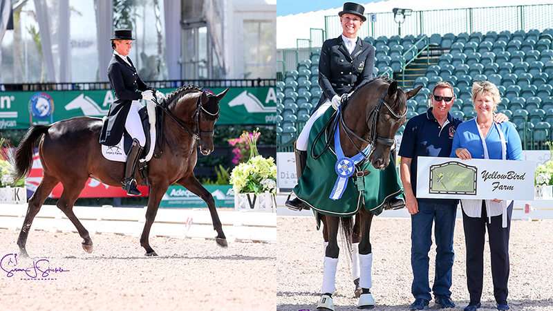 For Immediate Release Alice Collins for Jennifer Wood Media, Inc. Wellington, FL – March 27, 2018 – It’s taken 16 attempts this season, but Melissa Taylor (USA) and Ansgar finally have a blue sash and a winner’s blanket to their name after winning the Prix St Georges CDI3*, presented by Yellow Bird Farm. It was the only class on the opening day of action during week 12 of the 2018 Adequan Global Dressage Festival (AGDF) at Palm Beach International Equestrian Center (PBIEC) in Wellington, Florida. This popular CDIO (which incorporates the Nations Cup team competition) had to be extended by a day – starting early, on Tuesday – to accommodate the huge number of accepted entries across the plethora of international classes. The 2018 AGDF concludes on Saturday, March 31.