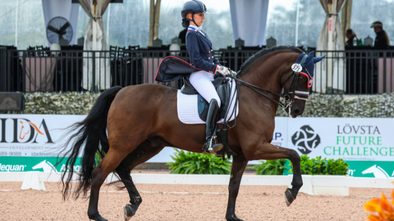 I started riding at a barn in a small town in Tennessee when I was just four years old. I got my first horse named Barberry, a first-level schoolmaster who taught me quite a bit during my first few years. After he retired, I got a second horse named Sergio, who took me above second level. He was so amazing, and I was so grateful to ride him. Once we moved barns, we contacted someone who had connections in Florida, so we ended up coming down to see Wellington, and we attended our first Friday Night Stars. Once we returned to Tennessee, we ended up leasing Sergio out while looking for horses. After quite a search, I met Briar, who, surprisingly, was my Christmas gift. We started out competing first level while we were still getting to know each other, and now we are competing at the Junior level in CDIs. In 2022, we were able to attend our first North American Youth Championships and Festival of Champions, and Briar was such a star for both competitions.