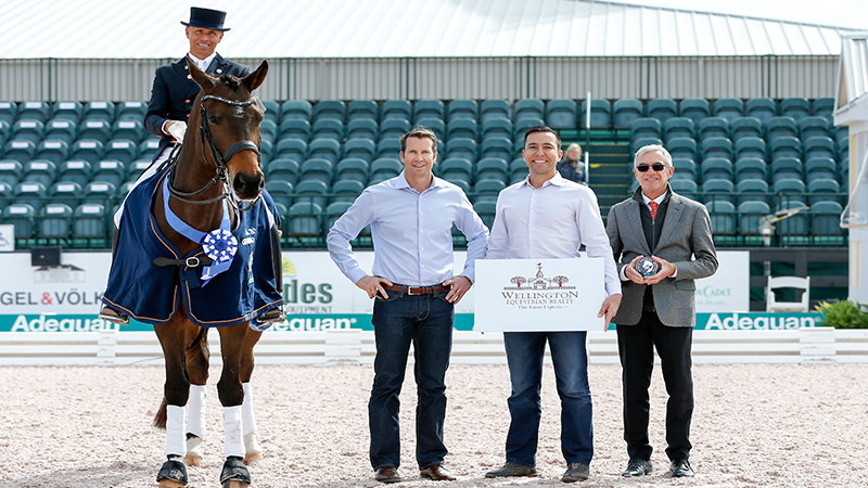 Steffen Peters and Rosamunde in their presentation ceremony with Craig Martin and Rob Desino of Wellington Equestrian Realty alongside judge Gary Rockwell.