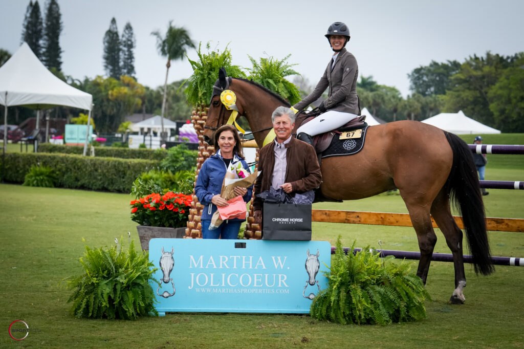 Natalie Dean—aboard Mr. Boombastic—is presented with the Martha Jolicoeur, Douglas Elliman Leading Lady Rider Award by Martha Jolicoeur (left) and Dr. Stephen Norton (right). Photo ©Sportfot