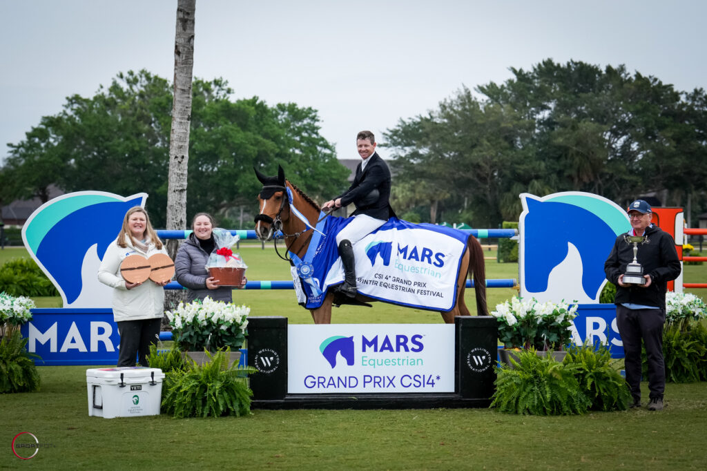 Shane Sweetnam & Coriaan van Klapscheut Z are presented as winners of the $215,000 MARS Equestrian CIS4* Grand Prix by Deidra Pitts (left), Equestrian Operations Team Lead for MARS Incorporated, and Bonnie Foord (right), Sponsorship & Events Manager for MARS Equestrian. Sweetnam also earned the Village of Wellington Cup, presented by Michael Stone, President of Wellington International. Photo ©Sportfot