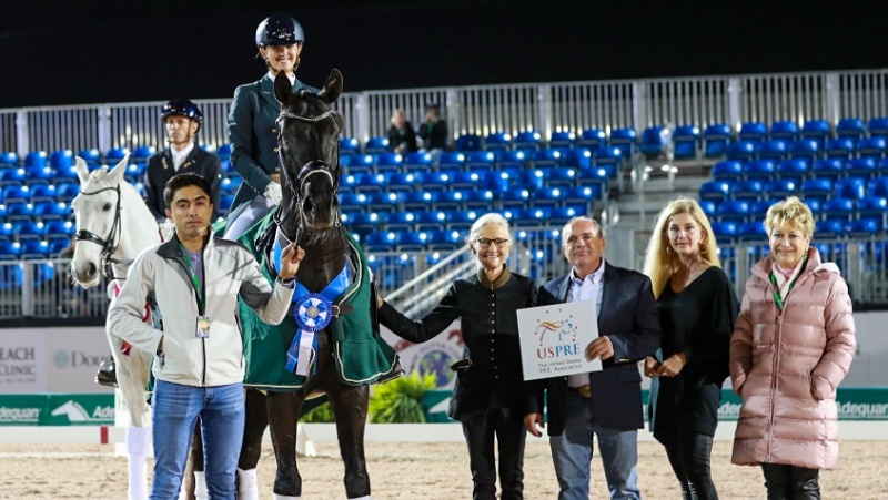 Janne Rumbough of class sponsor U.S. P.R.E. Association said: It’s been amazing how the P.R.E. horses have developed in this country because U.S. P.R.E. Association has promoted them. We have programs all over the country. Jane Bistline, the new President of the Association, added: If you look at the national and international shows in the U.S., about 10% of the horses are P.R.E. horses, and it used to be almost none. We’re here for all of the Iberian horses. We’re really excited and grateful to be sponsoring.