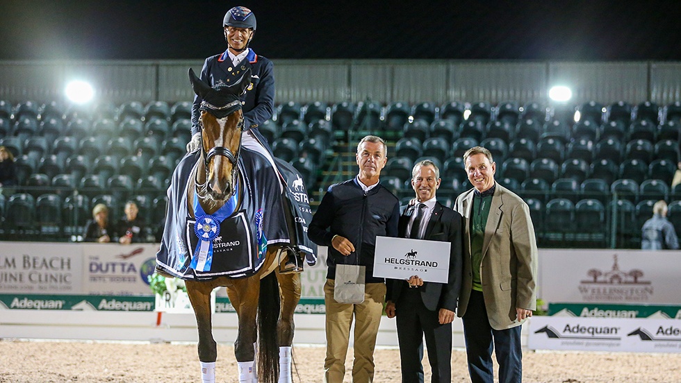 Steffen Peters in the prize-giving with Ulf Moller of class sponsor Helgstrand Dressage, judge at C Lee Tubman and Adequan ‘s Allyn Mann. (C)Susan Stickle.