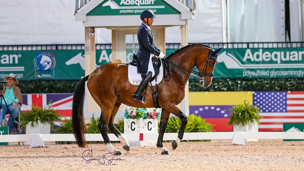 At small tour, Cesar Parra (USA) claimed victory from the 12 starters in the FEI Prix St. Georges CDI3*, presented by The Dutta Corp. He rode GK Don Cesar, a 10-year-old by Desperados, to 71.274%, a new personal best at the level. This was their second win of the 2020 AGDF. Ariana Chia (CAN) on Fiderflame finished second with 70.196%, with the USA’s Jami Kment filling third with 70.147% on Gatino Van Hof Olympia.