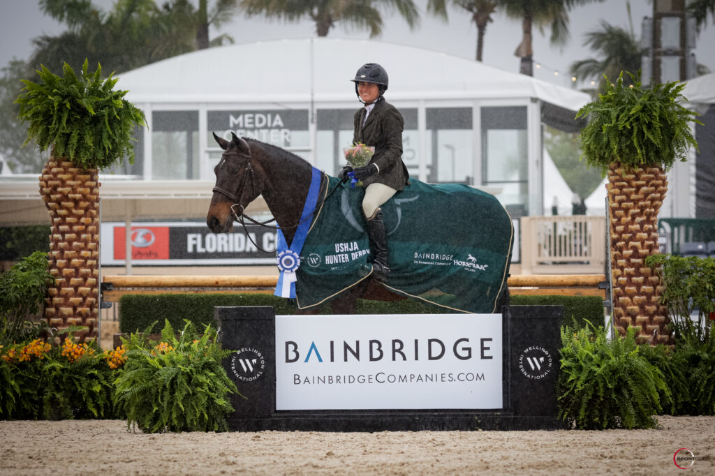 Winner of the $10,000 USHJA National Hunt & Go Open Derby, also sponsored by Bainbridge Companies, was Victoria Colvin of Loxahatchee, FL, and her mount Perrier-Jouet, a 7-year-old Belgian Sport Horse by Carioca. For their second derby win in as many weeks, the pair boasted scores of 91 and 93 for a grand total of 184 points to take home the win for owner Macquarie Simon.