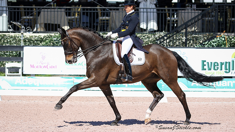 Kasey Perry-Glass and Goerklintgaards Dublet (Diamond Hit x La Costa) owned by Diane Perry, seemed to have the test that could take the win in the AGDF FEI Grand Prix, right until the last rider hit the centerline. Tinne Vilhemlson-Silfven and Don Auriello, a 2002 Hanoverian gelding (by Don Davidoff x Wey o mey) would ultimately lead the victory gallop. Vilhelmson-Silfven and Don Auriello demonstrated the maturity and technical skill that have earned them international recognition, signaling a strong return to the competition ring after a very successful European tour and first CDI competition at AGDF 1 in Wellington, FL. Earning a 76.080% from the judges, the duo’s test was a stunning example of a partnership that continues to impress with balletic athleticism combined with grace under pressure, even with a small error in the two-tempi changes.