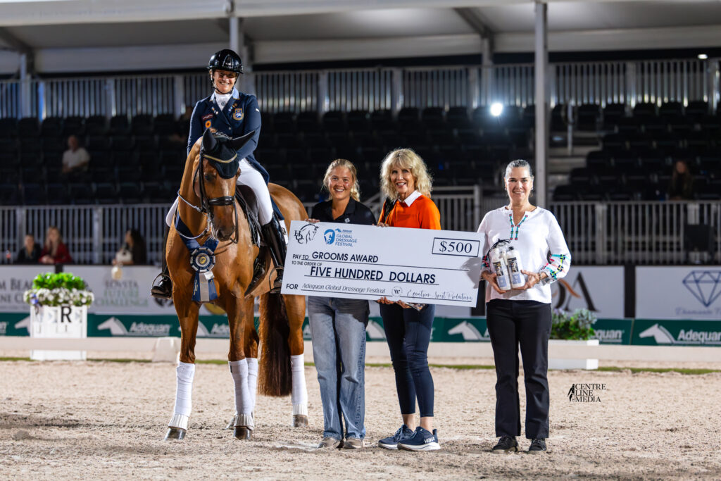 “I’ve been resting this freestyle and it’s dear to me,” said Vilhelmson Silfvén, whose groom Anna Forsman was presented with the groom’s award and a check for $500, sponsored by The Horse of Course. “I realized that some of the judges haven’t heard it either. My goal tonight was that Hyatt would trust me and go. She was ‘on it’ and yet could still walk out on a long rein and be a happy horse, and I’m very pleased about that.”