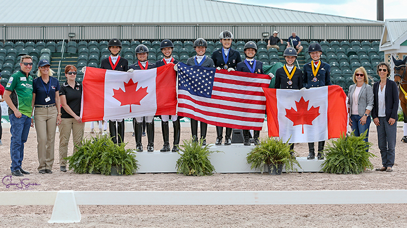 Finishing just off the pace for the silver medal was the Canada 1 team, who had a total of 137.882. The team consisted of Naima Moreira Laliberte (22, Montreal, Quebec), Laurence Blais Tetreault (22, Montreal, Quebec), and Tanya Strasser-Shostak (23, Sainte-Adèle. Quebec). Riding I Do Kiss, a 13-year-old Swedish Warmblood stallion owned by KML S.A.R.L., Moreira Laliberte had the highest score of the class with a 71.706%. This was a personal best today, actually the best he’s ever felt for me, so it’s nice to see some results from the work put into it, she said of her partner of two years. It’s really rewarding. Blais Tetreault had a fifth-place finish in the class on a score of 66.176% on Utah, an 18-year-old KWPN gelding by Jazz owned by her sister, Mathilde Blais Tetreault. She was very happy with her team experience. I’ve been with those two girls doing juniors, young riders, and now U25, so that’s just awesome, she said. We know each other really well, and we know we work well on a team, so that’s the cherry on top for the experience. And the horse was good too, so I’m happy with it. Strasser-Shostak and Dejà vu Tyme, a 12-year-old Hannoverian gelding by Dauphin owned by Erika Murphy, was very happy with her horse of two-and-a-half years. When we first got him, he was really green with everything, with show experience and just generally in his levels, she said. I’m really pleased with how he’s progressed within the time that we’ve had him. I never would have thought that I would have him in a Nations Cup in two years, if you would have asked me at the time. I’m just really happy with the way he’s been handling the environment, and just generally his work ethic has been really great.